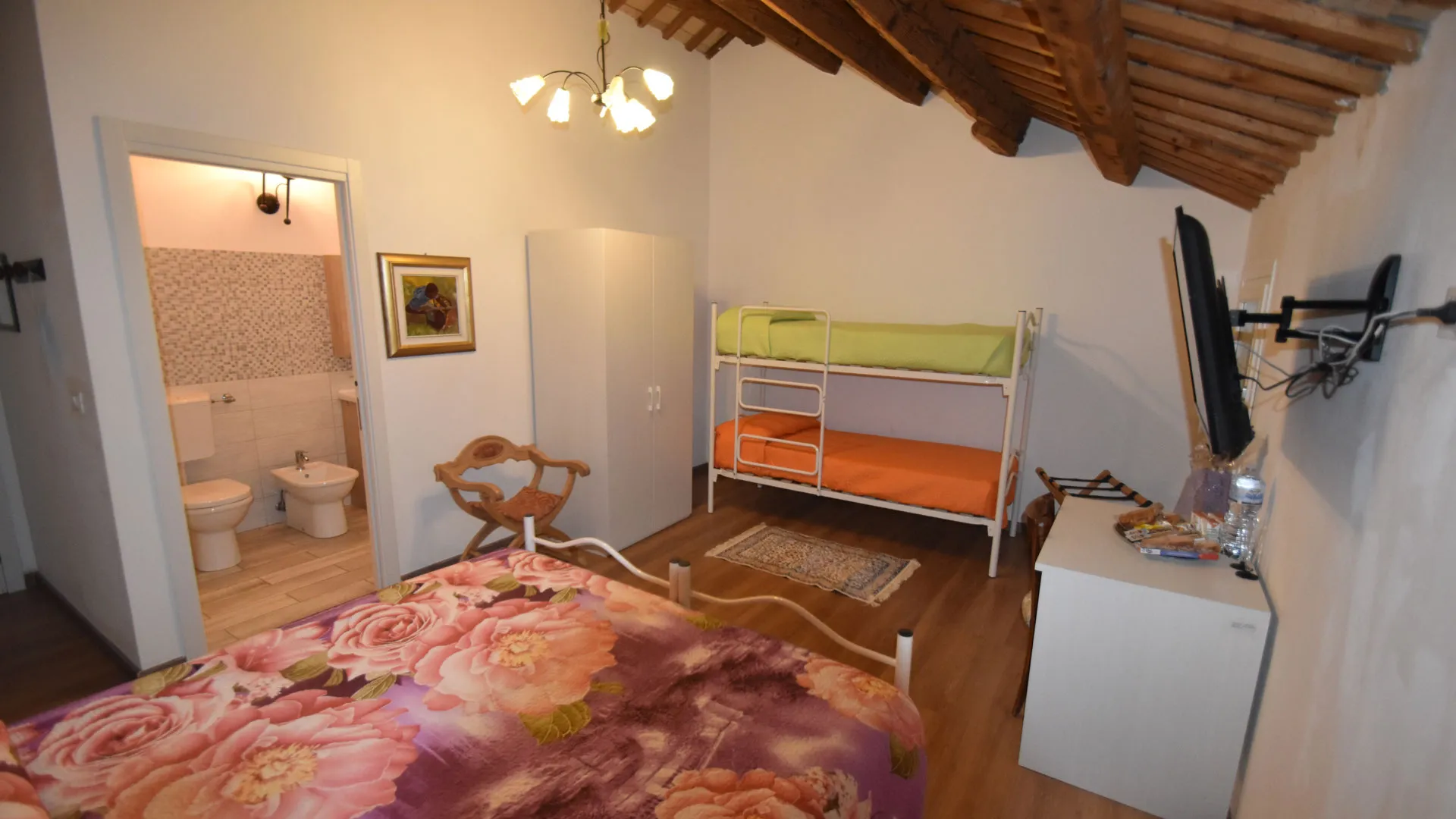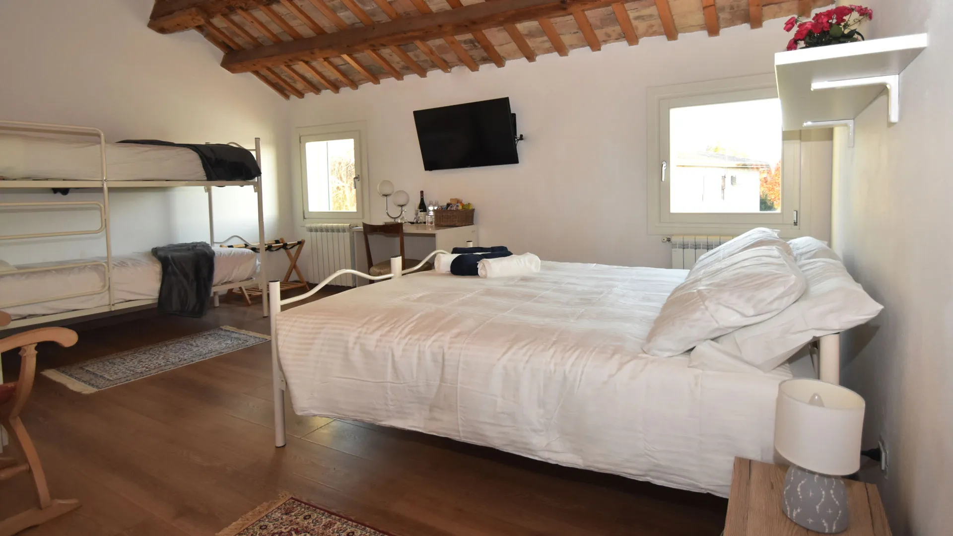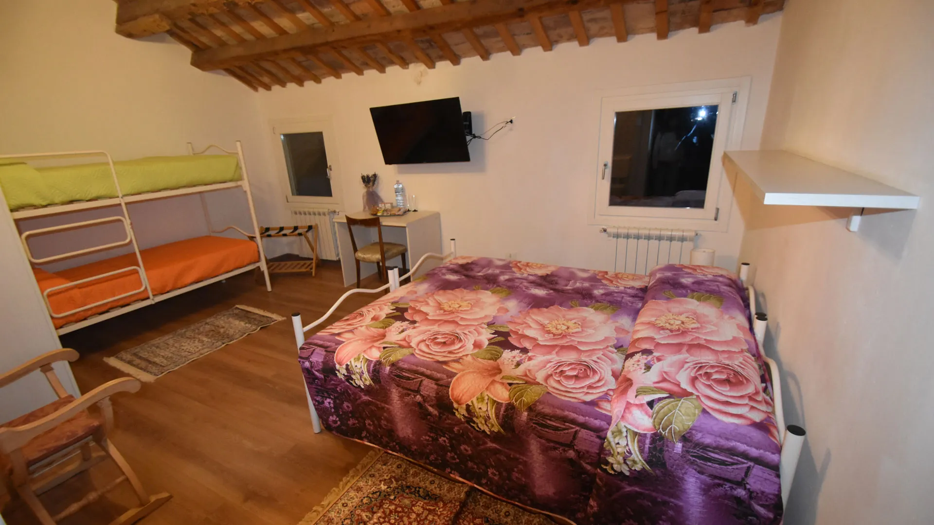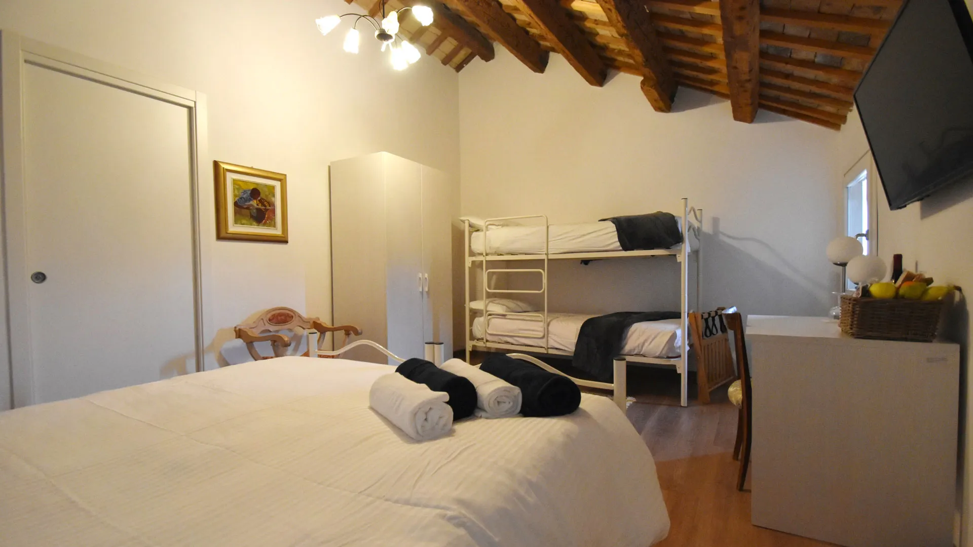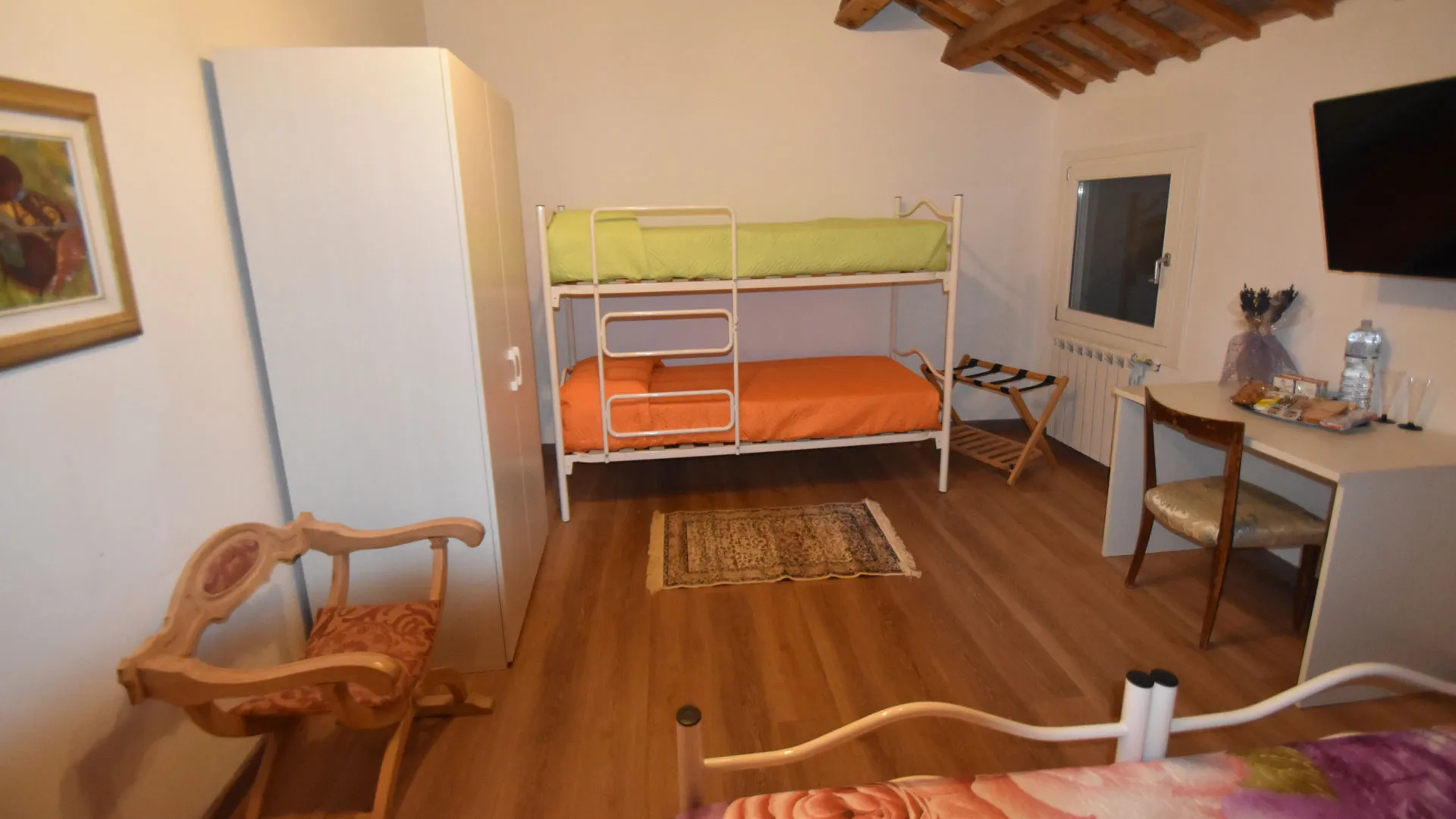 Room Annalisa è una stanza accogliente e funzionale, ideale per ospitare fino a 4 persone. Dispone di due letti singoli unibili a formare un comodo letto matrimoniale e di un letto a castello, perfetta per famiglie, amici o piccoli gruppi.